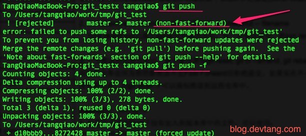 一旦推送到远程仓库后,就不要用类似 git reset, git ci --amend, git rebase 等破坏性提交了,否则远程仓库会因为你的新推送不是 Fast Forward 而拒绝提交 (关于什么是 Fast Forward 要讲的太多了,自已看书吧)。如果实在不小心做了。在确定别人没有检出前,用 git push -f 可以强制推送到远程仓库中。如下图: