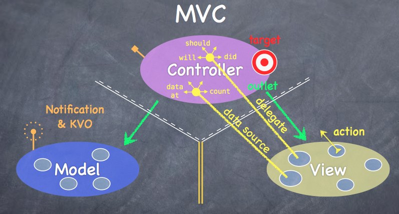 MVC 模式算是客户端类程序使用的设计模式的标配了。iOS 对于 Model, View 和 Controller 之间的相互调用有它自己的规范和约定,在公开课的 第一课 中,就介绍了应该如何将 MVC 模式应用在 iOS 开发中。主要的内容就体现在如下这张图中 (图片来自该公开课第一课的 配套 pdf 的第 37 页):