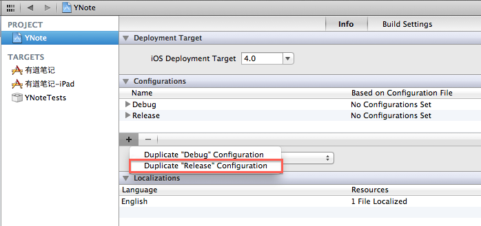 但在 daily build 中,用 Release 用为 configuration 其实不是特别好。因为 Release 的证书可能会被经常修改。我们可以基于 Release 的 Configuation,建一个专门用于 daily build 的 configuration。方法是:在工程详细页面中,选择 Info 一栏,在 Configurations 一栏的下方点击 “+” 号,然后选择 “Duplicate Release Configuration”, 新建名为 “DailyBuild” 的 Configuration, 如下图所示: