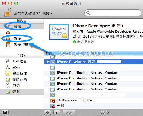 遇到的问题 本来我写的自动化脚本在 Mac OS X 10.6 下运行得很好。但是升级到 lion 后,脚本在手动执行时很正常,但是在用 crontab 启动时就会出现找不到开发者证书的错误。在网上搜了很久也没有找到解决办法。最后我试了一下在 “钥匙串访问” 中把开发者证书从 “登录” 那栏拖动到 “系统” 那栏,居然就解决了,如下图所示: