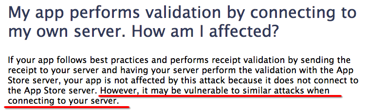 但是就象苹果自己也意识到的那样(如下图),既然破解者可以欺骗设备来和AppStore通讯,那么同样破解者从原理上,也可以欺骗设备同我们自己的服务器通讯,到头来,设备本身无论如何是无法知道自己的信息的真实性的。