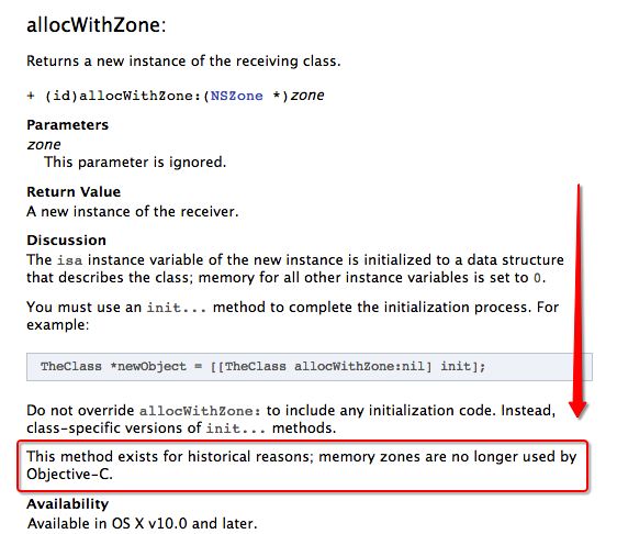 自从 Mac OS X 10.5 上引入了垃圾回收机制后,苹果就不建议程序员使用 allocWithZone 了,事实上,cocoa 框架也会忽略 allocWithZone 指定的分区。苹果在文档中也 提到,allocWithZone 仅仅是一个历史遗留设计了。下图是苹果的文档截图: