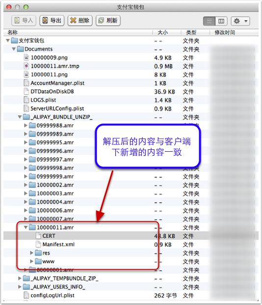amr 本意表示是一个音频文件,明显不对,尝试将其后缀名改成 zip,成功将其解压。用 itools 连接上支付宝的客户端,同样能看到客户端将其下载后,也是解压到 document 目录下的。解压后的内容与应用内新增加的内容一致,如图所示: