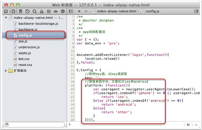 另外,使用基于 UIWebView 的方式来展示插件,也有利于代码的复用。因为这些逻辑都是用 js 来写的,可以同样应用于 Android 平台,在 Config.js 文件中,明显可以看到对于各类平台的判断逻辑。如下图所示: