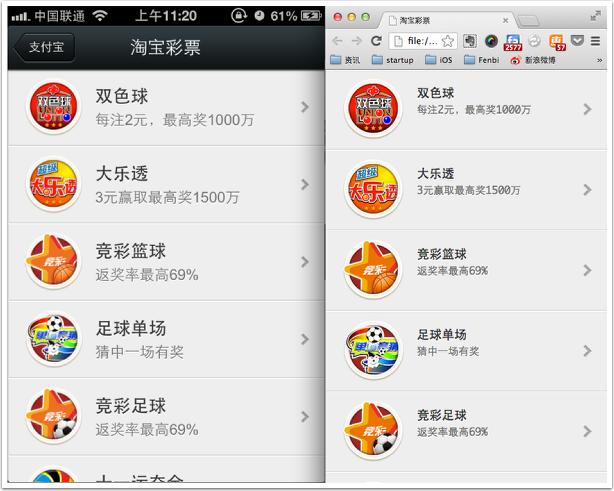 另外,/www/demo/index-alipay-native.html 文件即该插件的首页,用浏览器打开就可以看到和手机端一样的内容。如下载图所示(左半边是手机上的应用截图,右半边是浏览器打开该 html 文件的截图):
