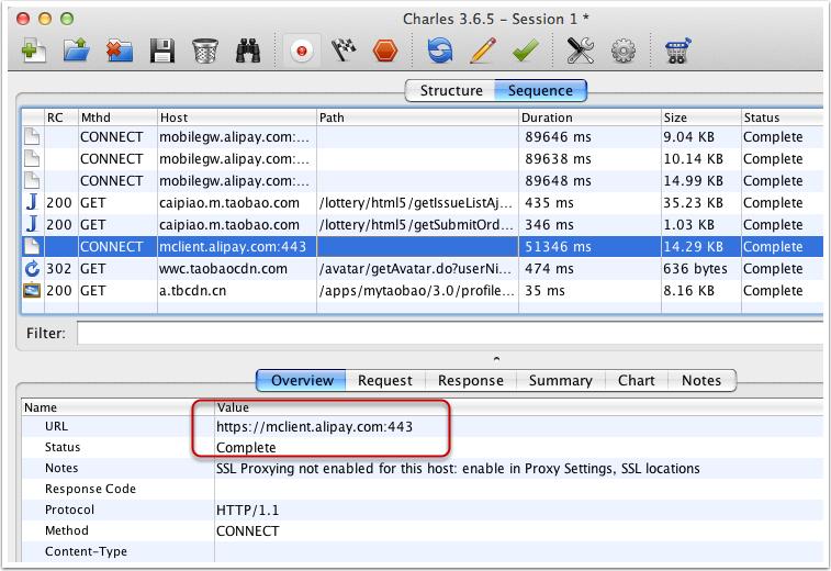 用 Charles 可以截取到,当有网络交易时,应用会另外启动一个 https 的安全链接,完成整个交易过程的加密。如下图所示: