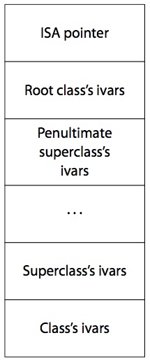 如果把类的实例看成一个 C 语言的结构体(struct),上面说的 isa 指针就是这个结构体的第一个成员变量,而类的其它成员变量依次排列在结构体中。排列顺序如下图所示(图片来自《iOS 6 Programming Pushing the Limits》):