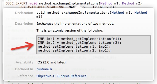 method_exchangeImplementations的内部实现相当于调用了 2 次method_setImplementation方法,从苹果的文档中能清晰地了解到(如下图所示)
