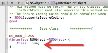 该图中,最让人困惑的莫过于 Root Class 了。在实现中,Root Class 是指 NSObject,我们可以从图中看出: