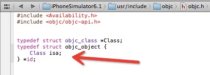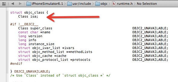 在 XCode 中按Shift + Command + O, 然后输入 runtime.h,可以打开 Class 的定义头文件,通过头文件我们可以看到,Class 也是一个包含 isa 指针的结构体,如下图所示。(图中除了 isa 外还有其它成员变量,但那是为了兼容非 2.0 版的 Objective-C 的遗留逻辑,大家可以忽略它。)