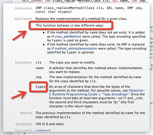 class_replaceMethod在苹果的文档(如下图所示)中能看到,它有两种不同的行为。当类中没有想替换的原方法时,该方法会调用class_addMethod来为该类增加一个新方法,也因为如此,class_replaceMethod在调用时需要传入types参数,而method_exchangeImplementations和method_setImplementation却不需要。