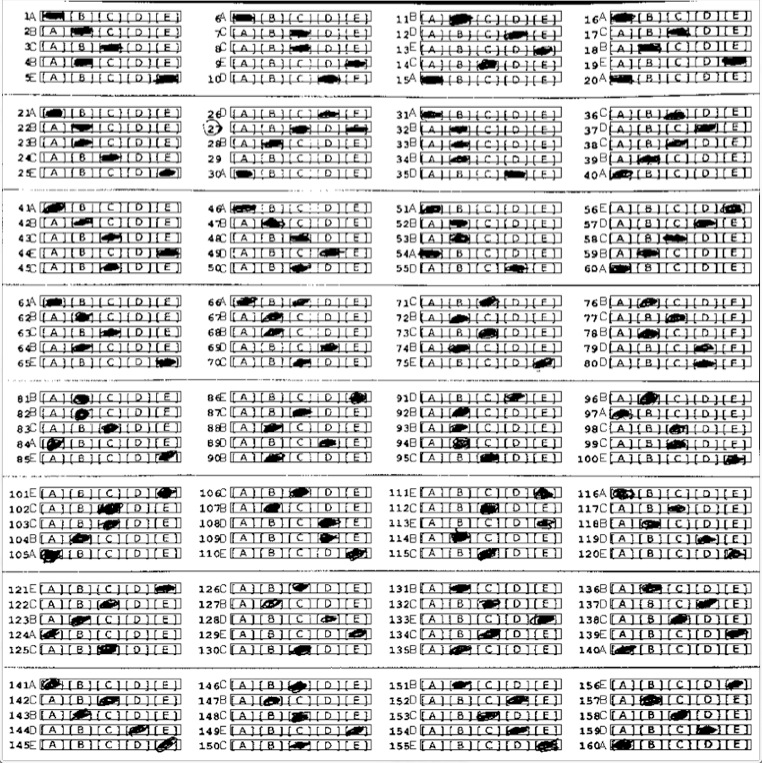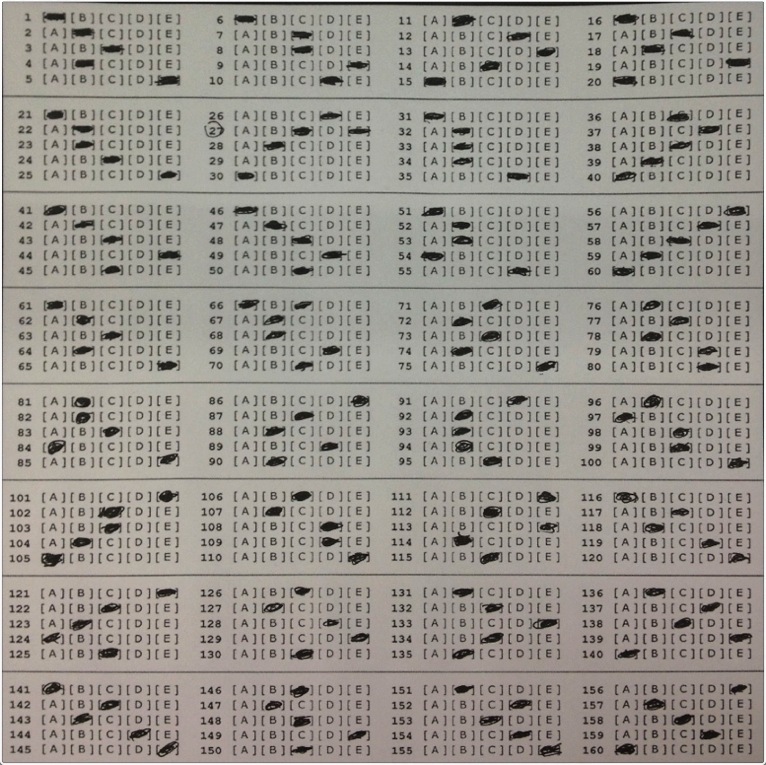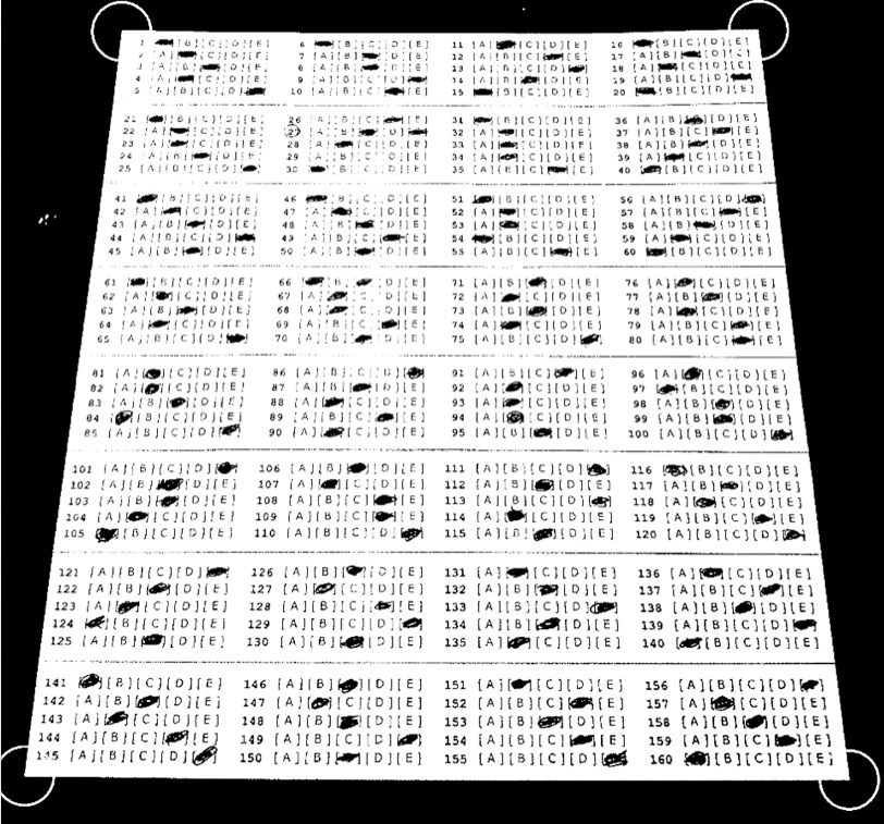 上图是一个我们试验用的答题卡,通过手机摄像头获取,从中可以看到,该答题卡有以下问题: