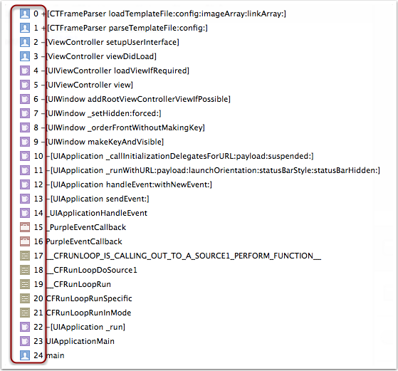 你注意到了吗?在 Xcode 中,当你点击查看调用栈的时候,调用栈的每个方法前面都有一个 Icon,而且还有好几种不同的样子,如下图所示,你知道它们代表什么意思吗?
