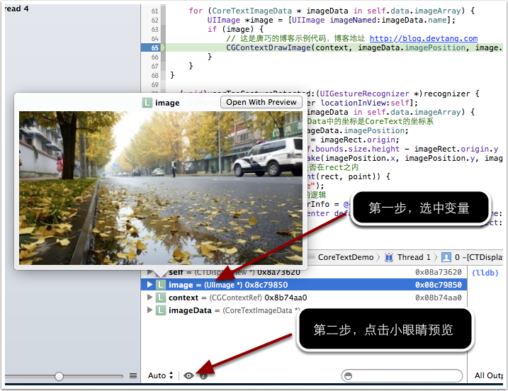 在 XCode5 中,点击一个小眼睛图标,就直接预览 UIImage 的内容,如下图所示: