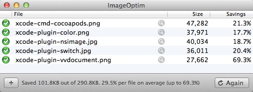 如果你从未尝试过 ImageOptim 一类的图片压缩工具,那么第一次给 IPA 文件瘦身的效果应该是比较惊人的。我个人的经验是,初次使用时 ImageOptim 能减少至少 10% 的应用图片资源占用。