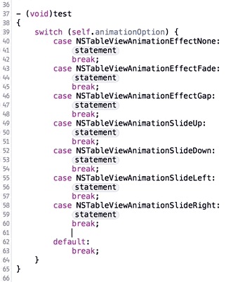 例如,当你输入switch,然后键入一个NSTableViewAnimationOptions类时,该插件会将其可能的取值补全在每一个case之后,如下图所示: