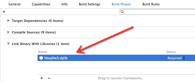 使用本项目,你需要将开源代码中的YTKKeyValueStore.h和YTKKeyValueStore.m添加到你的工程中,并且在工程设置的Link Binary With Libraries中,增加libsqlite3.dylib,如下图所示: