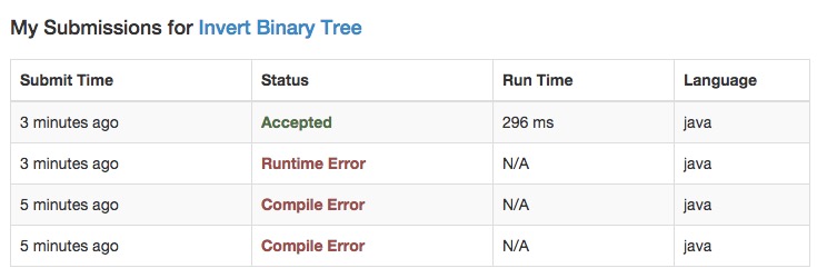 编译错了两次,之后运行错了一次,出现了 NullPointerException,于是想到没有检查指针为空,加上检查之后,就通过了。下图是提交记录。