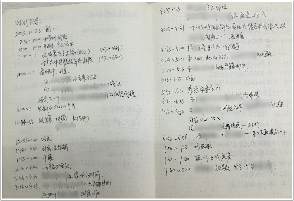 数据分析的工作让我知道任何的改进都是应该基于数据的,这样更加理性。所以,我拿了一个小本子,记录自己每天的详细时间花费情况。于是就有了下图这样的一页一页的记录。