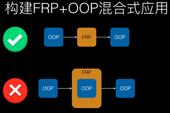 最后用 RAC 宏、RACSignal#subscribe、NSObject+liftSelect 这些操作把 FRP 的世界带回到 OOP 的世界里。