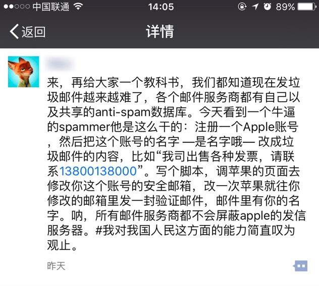 最近从几个做 iOS 开发的小伙伴那儿听说了几个发垃圾邮件的黑科技,利用的都是苹果的一些小「漏洞」,实在是让人觉得中国人的「创新」能力太强,分享给大家。