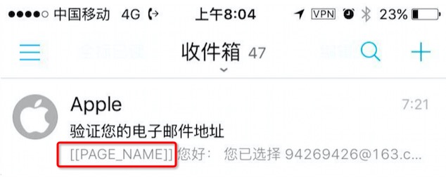 苹果在发现这个漏洞被利用后,简单把用户昵称在邮件中不再显示了,不过可以看得出来改动非常匆忙: