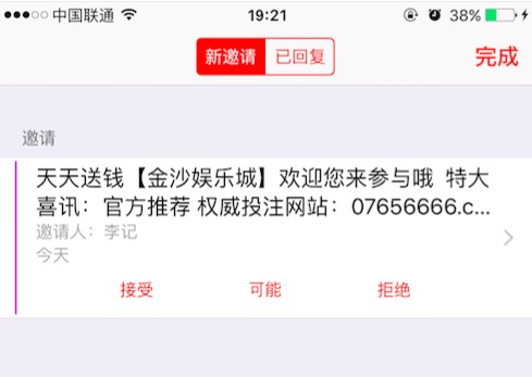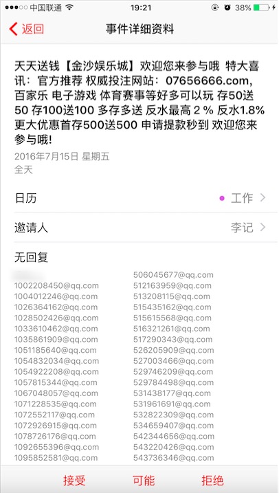 在方法一被苹果封堵后,前两天,梁杰发现了一个新的垃圾邮件发送行为。这次利用的是苹果的共享日历的功能。黑客利用将广告以日历日程的形式共享给大家,以便获得展示广告的能力。