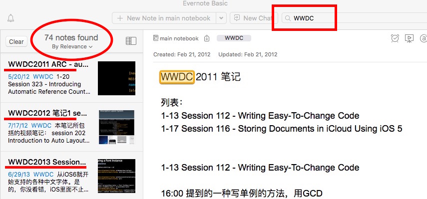- 看 WWDC 的视频。因为由苹果官方提供,并且每年更新,所以 WWDC 是学习 iOS 开发新知识最好的渠道。我利用我每天上下班坐地铁的时间来学习,遇到一些关键的知识在地铁上不好做笔记,我会直接用截屏的方式把这些知识截下来,然后晚上在家里再把内容整理下来。下图是我在 Evernote 中记录的 WWDC 笔记,大家可以看到,一共有 70 多篇。