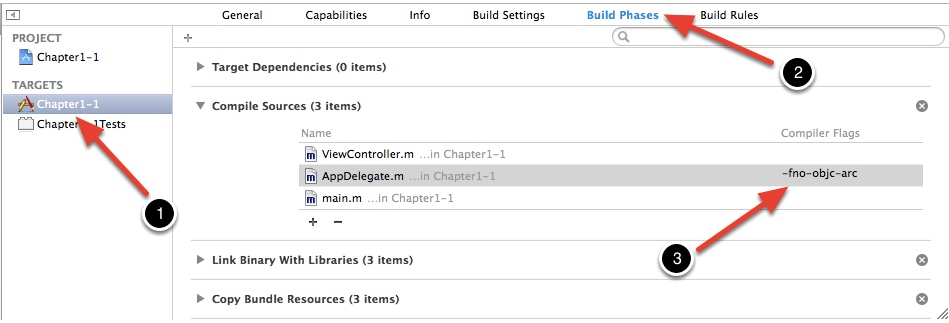 为了更形象一些,我们再来看一段 Objective-C 的代码。新建一个工程,因为现在默认的工程都开启了自动的引用计数 ARC(Automatic Reference Count),我们先修改工程设置,给 AppDelegate.m 加上 -fno-objc-arc 的编译参数(如下图所示),这个参数可以启用手工管理引用计数的模式。