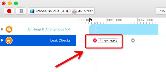 这个时候 iOS 模拟器会运行起来,我们在模拟器里进行一些界面的切换操作。稍等几秒钟,就可以看到 Instruments 检测到了我们的这次循环引用。Instruments 中会用一条红色的条来表示一次内存泄漏的产生。如下图所示: