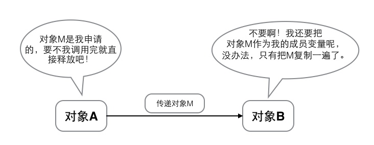 我们另外还有一种办法,就是对象 A 在构造完对象 M 之后,始终不销毁对象 M,由对象 B 来完成对象 M 的销毁工作。如果对象 B 需要长时间使用对象 M,它就不销毁它,如果只是临时用一下,则可以用完后马上销毁。这种做法看似很好地解决了对象复制的问题,但是它强烈依赖于 AB 两个对象的配合,代码维护者需要明确地记住这种编程约定。而且,由于对象 M 的申请是在对象 A 中,释放在对象 B 中,使得它的内存管理代码分散在不同对象中,管理起来也非常费劲。如果这个时候情况再复杂一些,例如对象 B 需要再向对象 C 传递对象 M,那么这个对象在对象 C 中又不能让对象 C 管理。所以这种方式带来的复杂性更大,更不可取。