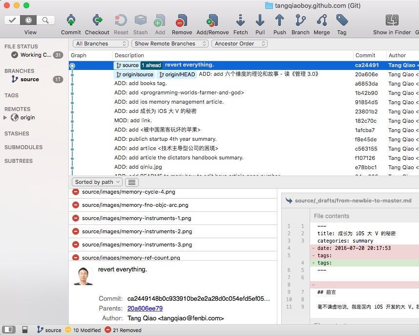 执行完上面两步后,你的仓库还是最新的提交,但是工作区变成了历史的提交内容,这个时候用 git add 和 git commit 即可。最终完成的效果如下:
