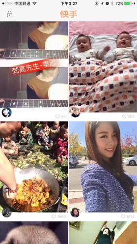 一种观点认为:快手成功的秘诀在于产品简洁和克制。这一点上快手确实做得非常特立独行。当你还没有注册登录时,打开快手,此里你能看到的就只有信息流,第一眼给人特别不精致的感觉,如下图所示: