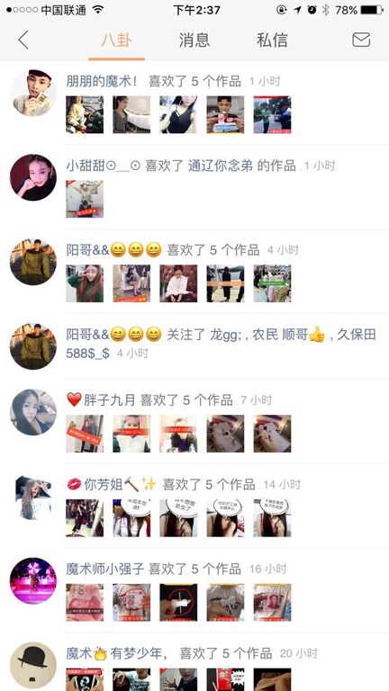 对于传播的鼓励,只有在快手侧边栏的「八卦」(如下图),能够有可能看到一些自己关注的人的行为。但是这个行为是聚合起来的,所以即使有一篇文章想传播,也比较难通过这个地方获得。