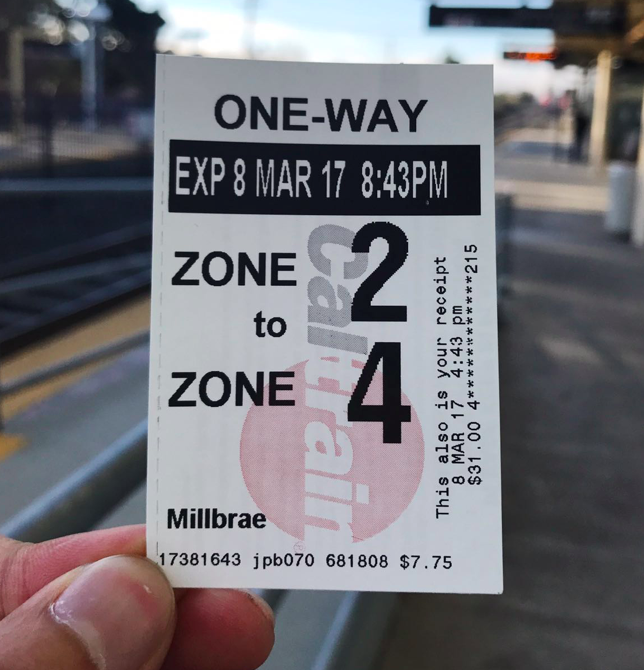 比如坐火车买车票,整个火车乘车区域是开放式的,火车站台上有自动售票的机器,你自己选择从哪儿坐到哪儿,然后刷卡购票。车上没有检票的列车员,如果你不买票,根本就没有人管你。下图是我们坐火车(Caltrain)时,自觉购买的单程车票。