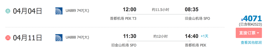 如果提前三个月买票,另外不是旺季的话,同时购买往返的机票,其实很容易选择到往返 4000 左右的机票。下图是我在去哪儿上随意搜到的 4 月份的北京往返旧金山的直飞机票,价格 4000 出头。