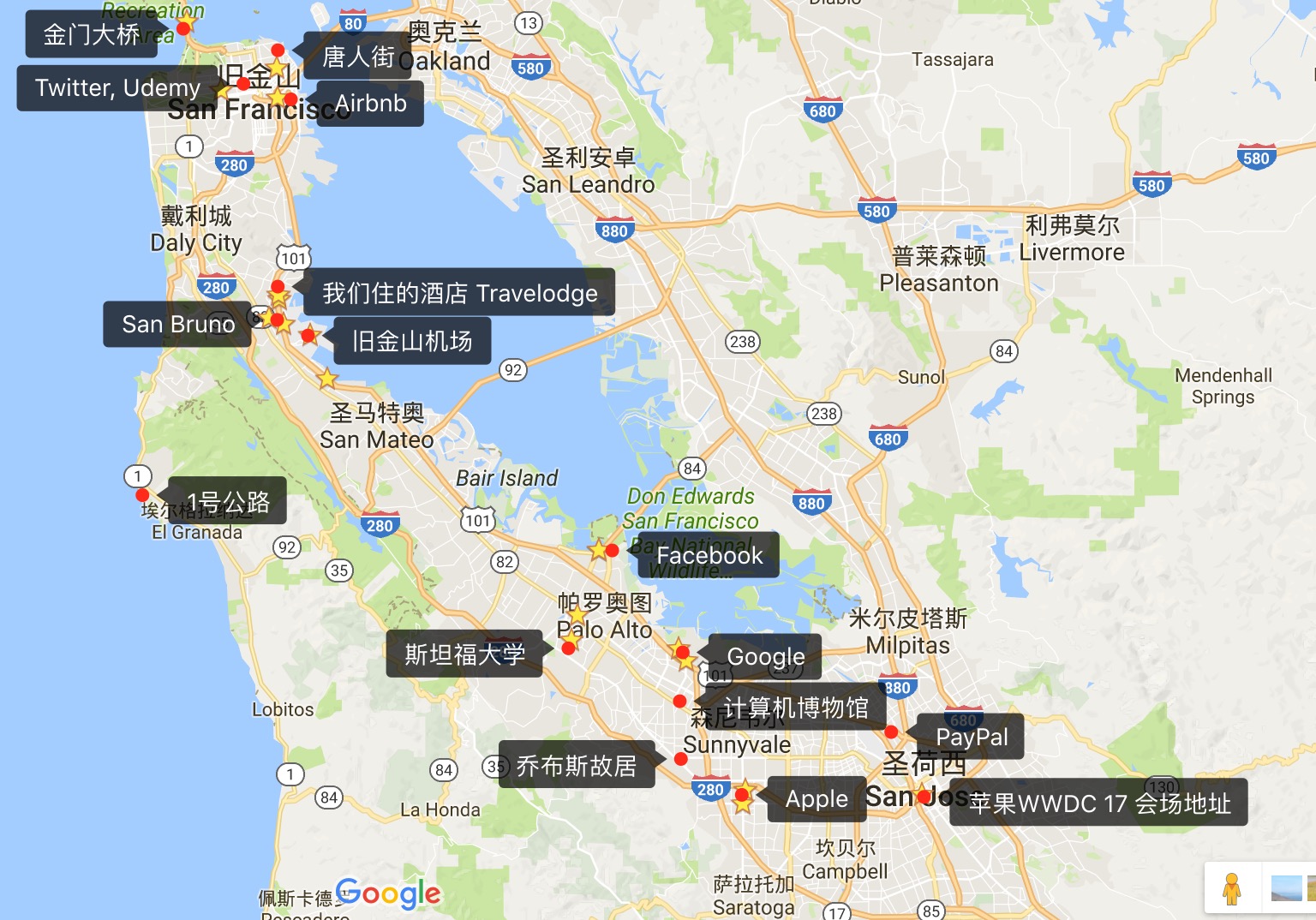 - 第二部分是南边的硅谷区域,可以在那儿逛 Facebook, Google, Apple, 斯坦福大学,计算机博物馆。