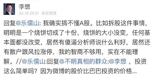 为什么我建议大家炒美股呢?因为美股相对于 A 股来说市场更加规范和成熟,我们炒股不是为了挣钱,而是培养商业的思考,如果你炒 A 股,你形成的商业思考很可能是错的,比如你可能会把 A 股理解成受政策影响巨大的市场,从而只关注于政府的利好利空消息,而不关注股票本身。A 股的环境不成熟和股民不成熟,更难使大家产生好的商业判断,所以我建议大家尝试美股。下图是车和家创始人李想评价 A 股的一段话: