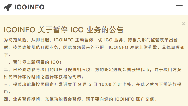 由于 ICO 的规则变化灵活,对确定监管主体和相关法规带来了难度。在国外,美国和新加坡都将 ICO 采取逐案评估的办法。而在中国,由于是新事物,国家的政策没有出来。但是至少我们可以看到,近期国家已经开始相关的监管工作了:一场本应于 9 月 2 日召开的区块链盛会被有关部门叫停,与此同时 ICOINFO 宣布暂停了 ICO 业务,比特币中国暂停 ICOCOIN 交易: