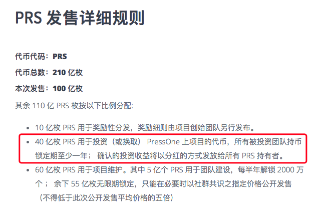 在分红权利上,PressOne 只介绍了 40 亿枚代币投资的项目有收益分红(下图)。而 PressOne 本身公司的经营收益如何分配,并未提及。