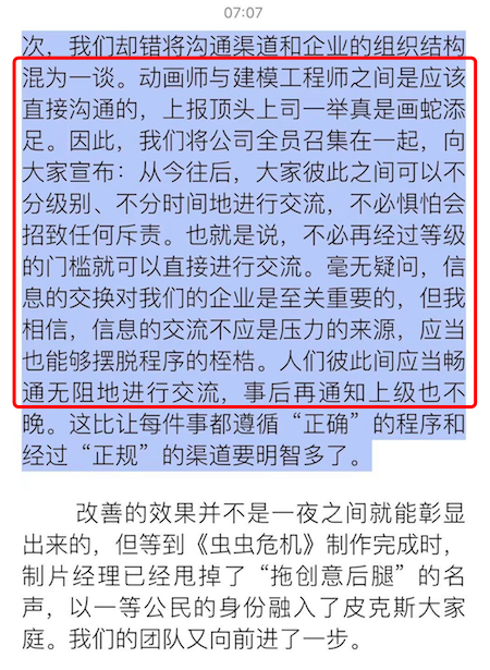 凑巧我在朋友圈看到另一个朋友读的《创新公司》一书,里面介绍了皮克斯公司的管理变化(下图)。作者的观点如出一辙:大家都是崇尚互联网的管理方式。