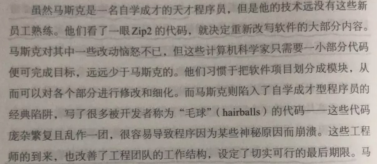 马斯克其实并不是一个很厉害的程序员,因为他并没有经过非常专业的训练,他只是非常聪明,非常努力。在书中,马斯克创立的 Zip2 在扩张时,从硅谷招来了一批厉害的工程师的时候,就出现了这样的一幕: