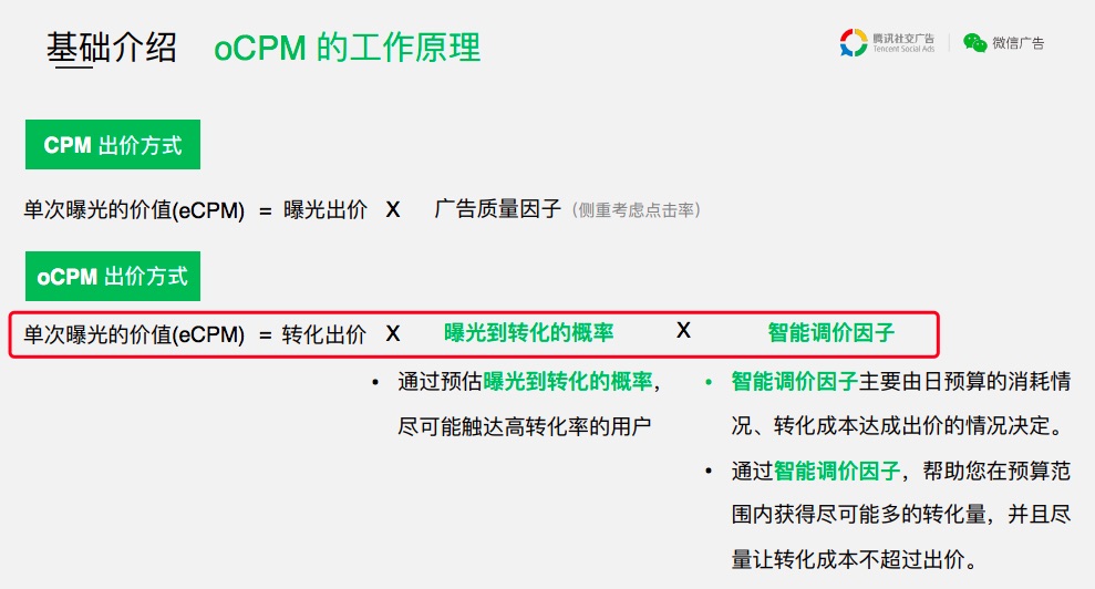 当 oCPM 变得更科学和动态之后,广告平台就利用 eCPM 来进行竞价了。eCPM 本质上是站在广告平台角度,看每个广告位带来的预期收益是多少。在腾讯的微信朋友圈广告投放 官方文档 上,我们可以看到 eCPM 的计算公式是: