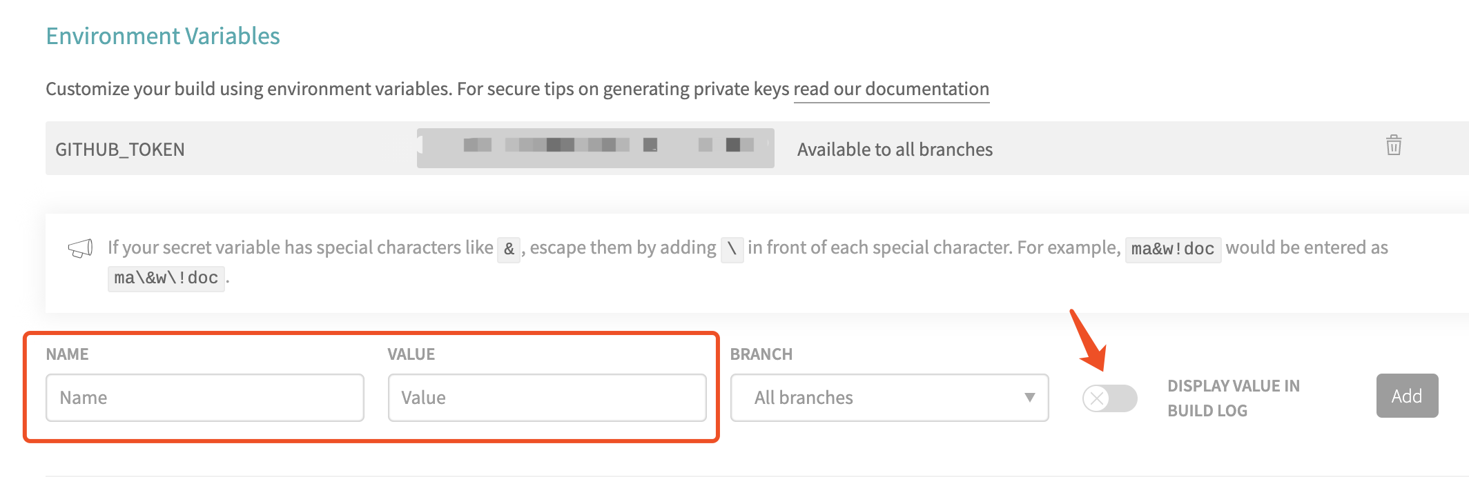 Environment Variables下,增加一个名为GITHUB_TOKEN的环境变量,值为你刚刚生成的OAuth Token值。为了方便调试,建议你勾选上DISPLAY VALUE IN BUILD LOG。如下图所示: