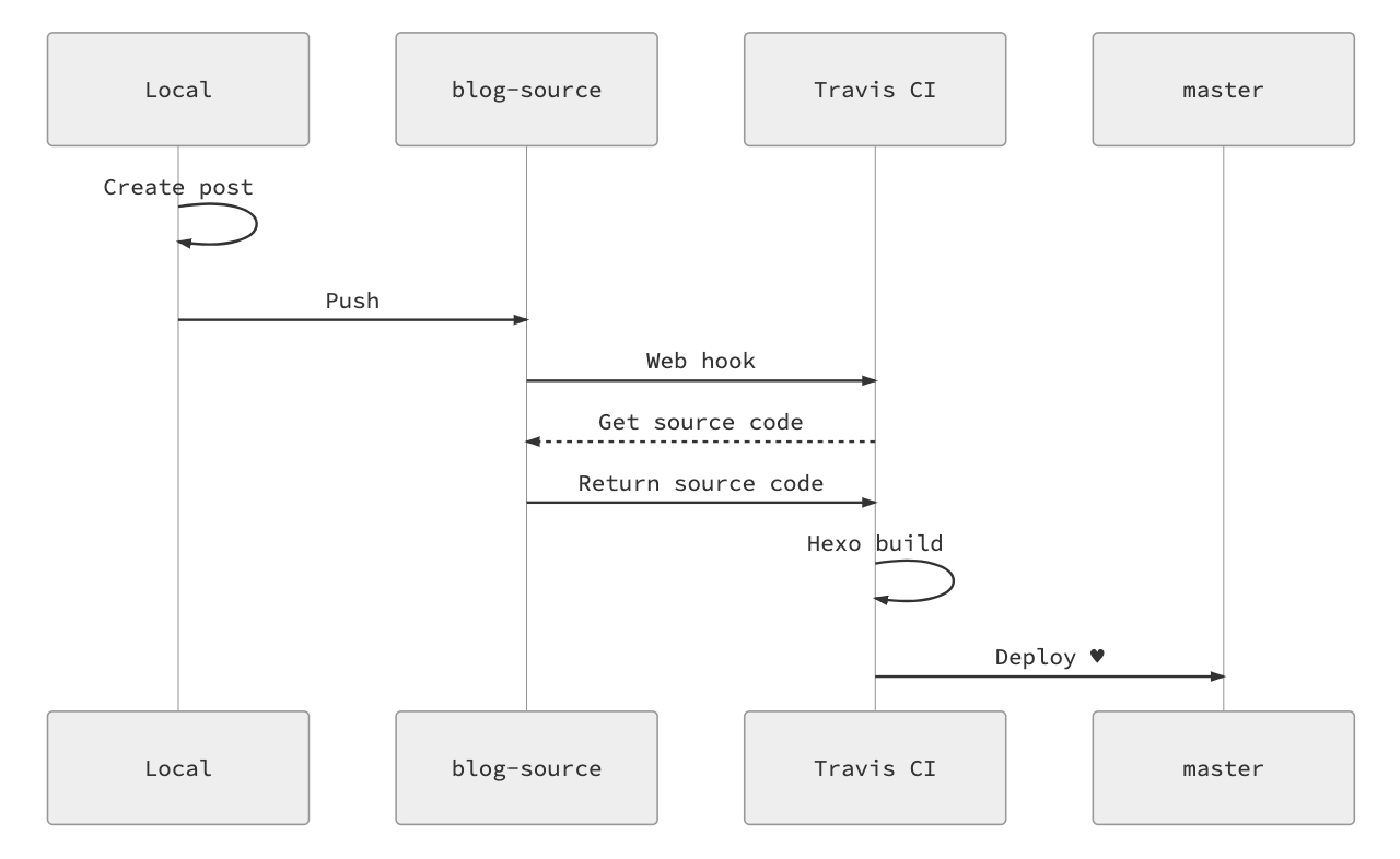 整个发布的流程如下图所示(图片来自这里),你只需要将本地的文章 PUSH 到 GitHub,GitHub 的 Web Hook 会通知到 Travis,之后 Travis 就会自动地从你的项目中获得博客文件,然后执行 Build 操作生成静态文件,然后再 PUSH 回你的博客仓库。