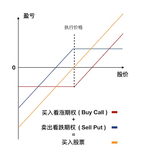 相比刚刚介绍的那种组合,以下的期权组合更被做市商所采用,即:买入看涨期权 + 卖出看跌期权。