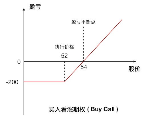 买入行权价 52 元的看涨期权的价格是 2 元,则盈亏曲线如下: