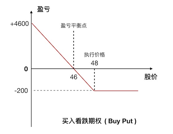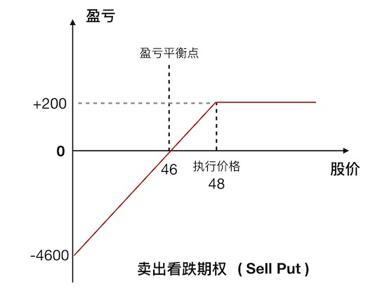 - 当股价低于 46 元,则有盈利。理论上,最高盈利是 4600 元,对应股价是 0 元。