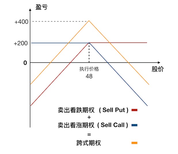 期权组合起来,可以构建一些特殊的盈利曲线。比如我们同时卖出看涨和看跌期权,就可以将以下两种曲线叠加。《麦克米伦谈期权》在 2.5.5 小结中介绍了这种被称为跨式期权的组合。