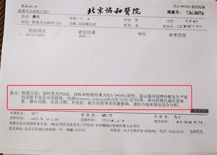别嘌醇对部分人会有超敏反应,严重情况致死。所以服用初期要密切关注身体状况。后来人们研究发现,超敏反应与白细胞 HLA-B5801 基因相关,所以在国内,有条件的医院就会在患者服用别嘌醇前,给他开HLA-B5801 基因的检测(这个检测也是可以走医保的)。